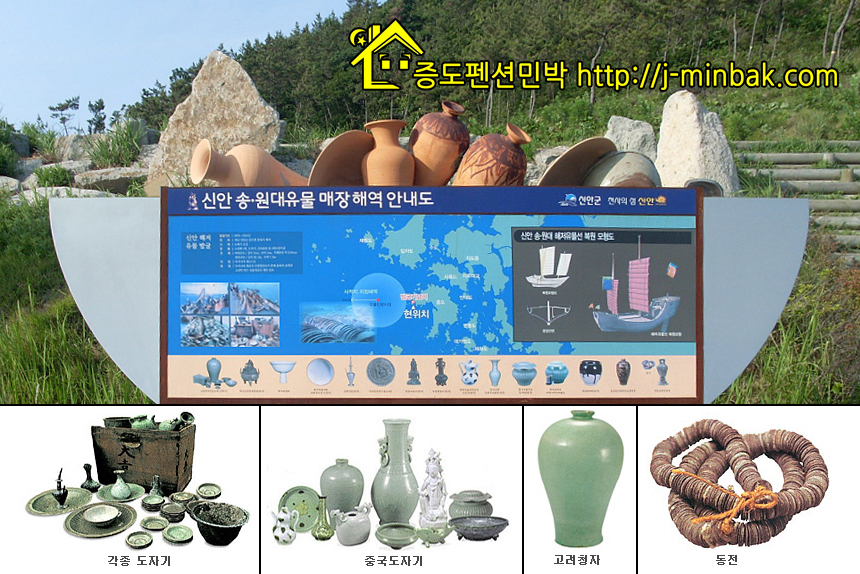 증도에는 서쪽 사적지를 찾아가면 섬 위에 배(트레져아일랜드) 전시관이 있으며, 170점을 복원하여 전시하였다. 방대한 규모의 신안해저유물은 14세기(원대 1323년 6월 초) 도자기를 실증적으로 보여줌으로써 고려, 동아시아의 원, 일본 3개국의 교역사와 문화를 이해하는 데 많은 도움이 되었으며, 그 당시 몽골과 일본이 국교를 맺고 있지 않았는데도 불구하고 경제적 교류(무역)가 이루어지고 있었음을 입증하는 결정적인 증거로 동양문화사 연구에도 마치 열쇠(타임캡슐)와 같은 자료를 제공하였다.